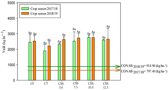 The grain productivity of winter common beans was not influenced by treatments in both agricultural years (Figure 11). The productivity was not statistically different with all CSS and CF treatments.