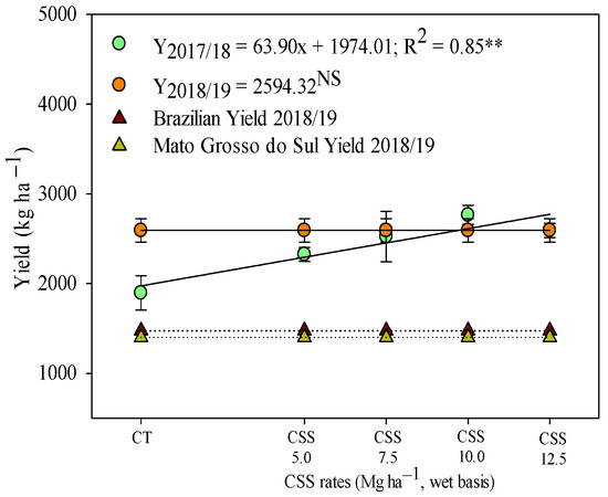Yield of common bean in response to residual application of composted sewage sludge (CSS) rates. ** and NS—significant at 1% and not significant, respectively. Productivity averages of color bean second crop [29]. Legend as in Figure 1.