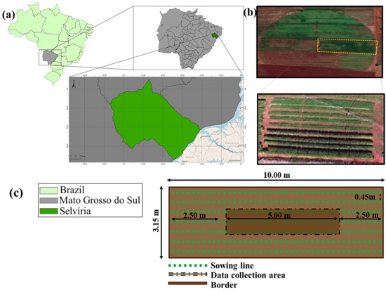 Experimental area located in the municipality of Selvíria at: 20°20′35″ S, 51° 24′04″ W; 358 m altitude; Mato Grosso do Sul State—MS, Brazil (a); aerial view of the entire experimental area and plots (b); schematic representation of a single plot with the individuation of the “useful area” for collecting soil and plant data (c).