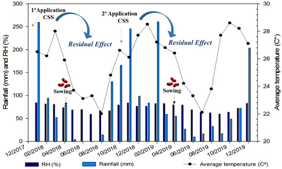 The common bean (Phaseolus vulgaris L.), cv. BRS Estilo, was used as a test plant. Bean plants were cultivated in the winter of 2017/18 and 2018/19 growing years. A desiccation of the vegetation cover was carried out with the application of herbicides Verdict R (37.41 g ha−1 active ingredient-ai) and Gramoxone (300 g ha−1 ai). The application of CSS was carried out in rice cultivation with two consecutive applications prior to common bean in the experimental area. The CSS was manually distributed over the total area within each experimental plot.
