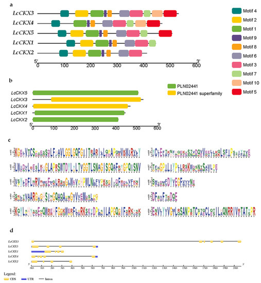 Gene structure and conserved motifs in LcCKXs. Phylogenetic relationships (a), conserved motifs (b), amino acid composition of each motif (c), and gene structure (d) of CKX genes of L. chinense. Differently colored boxes represent different themes and their positions in each LcCKX sequence.