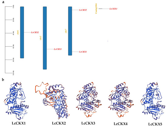 Chromosomal distribution of the CKX genes of L. chinense (a) and 3D structures of LcCKX oxidases showing functional sites (b). a: The scale located on the left panel is in bases, indicating chromosome sizes. The chromosome number is indicated on the left of each chromosome.