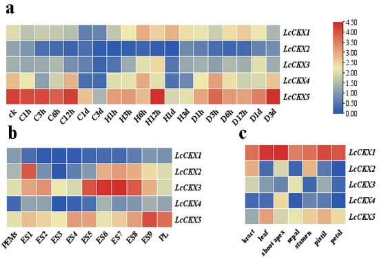 The transcriptome sequence data of L. chinense were downloaded from the NCBI SRA database, and the expression level of the genes was obtained using salmonid analysis. We determined the expression patterns of the LcCKX gene family in leaves under drought, cold (4 °C), and heat (40 °C) stresses (Figure 4a). LcCKX5 showed a strong transcriptional response under all three stresses. Specifically, the expression of LcCKX5 was up-regulated and peaked after 12 h and 3 d in response to heat and drought stresses, respectively. In contrast, the expression level of LcCKX5 decreased under cold stress. In comparison, LcCKX1, -3, and -4 responded to these abiotic stresses, but less strongly, while LcCKX2 seemed not to be expressed at all. The above results indicate that LcCKX genes differentially responded to different stresses and that LcCKX5 might be a valuable target for further research on the resistance breeding of L. chinense.