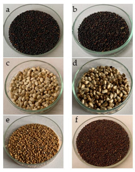 Analyzed seed samples: (a) rapeseed NS Svetlana, (b) rapeseed NS Jovana, (c) safflower NS Lana, (d) safflower NS Una, (e) white mustard NS Bela and (f) black mustard NS Crna.