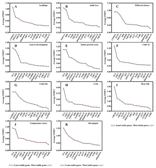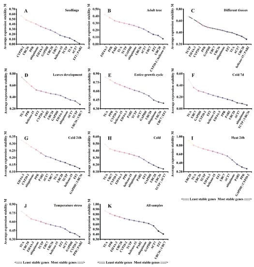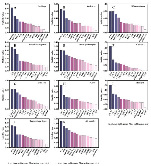 3.3. Estimation of the Stability of the Reference Genes under Different Experimental Conditions