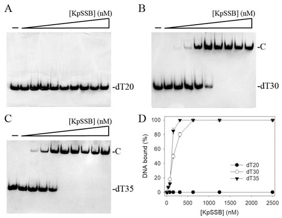Binding of KpSSB to ssDNA. Purified KpSSB (0, 20, 39, 78, 156, 312, 625, 1250, 2500, and 5000 nM) was incubated with biotin-labeled ssDNA (A) dT20, (B) dT30, and (C) dT35 at 37 °C for 60 min. (D) ssDNA-binding abilities of KpSSB. The binding constants ([Protein]50) were quantified through linear interpolation based on the protein concentrations. The errors are the standard deviation, as determined over 3 measurements.