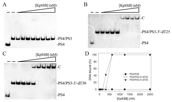 We also assessed whether KpSSB can form a complex with double-stranded DNA (dsDNA). The 25-base-pair (bp) dsDNA substrate PS4/PS3 was prepared by annealing two oligonucleotides (PS4 and PS3), of which the DNA strand PS4 was biotinylated. When we incubated KpSSB with PS4/PS3, no band shift was observed. Accordingly, KpSSB could not bind to this dsDNA (Figure 2A). In contrast to PS4/PS3, KpSSB could bind to PS4/PS3 with an ssDNA overhang of 25 and 30 mer dT. The ssDNA overhang was designed at 3′ (PS4/PS3-3′-dT25 and PS4/PS3-3′-dT30). Incubation of PS4/PS3-3′-dT25 (Figure 2B) and PS4/PS3-3′-dT30 (Figure 2C) with KpSSB produced a band shift and formed a stable complex. Through the titration curves of EMSA (Figure 2D), the binding constants of KpSSB to these ssDNA-containing duplex DNAs were calculated and compared. As shown in Table 1, the [Protein]50 values of KpSSB for the binding of dT30, PS4/PS3-3′-dT25, and PS4/PS3-3′-dT30 were 155 ± 20, 465 ± 52, and 356 ± 24 nM, respectively. Accordingly, KpSSB preferred binding ssDNA to binding ssDNA-containing dsDNA.