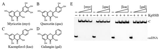 Myricetin is an inhibitor against PaSSB but not against KpSSB. Molecular structure of (A) myricetin, (B) quercetin, (C) kaempferol, and (D) galangin. These flavonols were used for inhibiting the activity of KpSSB. (E) KpSSB (625 nM) was incubated with each of these flavonols (0, 37.5, 100, and 300 μM). These compounds were dissolved in 10% dimethyl sulfoxide (DMSO). These flavonols did not inhibit the binding of KpSSB to dT30.