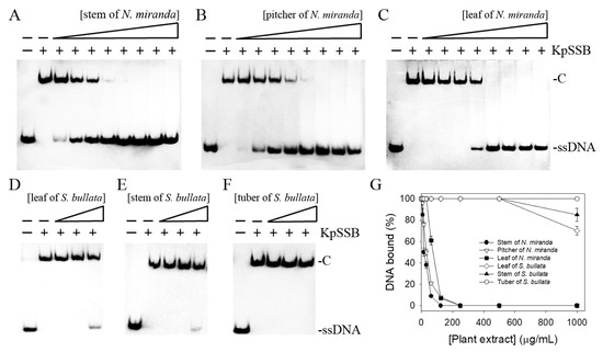 Inhibition of the ssDNA-binding activity of KpSSB by different extracts of N. miranda and S. bullata. KpSSB (625 nM) was incubated with the methanolic extract of (A) the stem of N. miranda, (B) the pitcher of N. miranda, (C) the leaf of N. miranda, (D) the leaf of S. bullata, (E) the stem of S. bullata, and (F) the tuber of S. bullata. Each of these extracts (at concentrations of 7.8–1000 μg/mL) was included in the binding assay. Among these extracts, the stem of N. miranda exhibited the greatest inhibitory effect against KpSSB. (G) IC50 determinations for KpSSB. The errors are the standard deviation, as determined over 3 measurements.