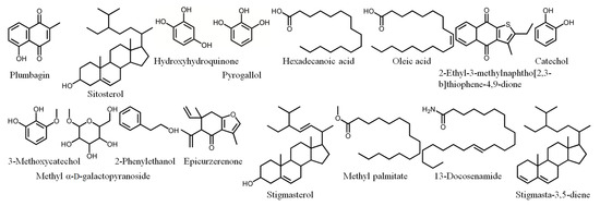 Owing to its high inhibitory capability toward KpSSB, the stem extract of N. miranda was chosen for GC-MS analysis to determine the compounds present. The compounds detected in this extract were tentatively identified by matching generated spectra with the NIST 2011 and Wiley 10th edition mass spectral libraries. The 16 most abundant compounds (>0.6%) were as follows: plumbagin, sitosterol, hydroxyhydroquinone, pyrogallol, hexadecanoic acid, oleic acid, 2-ethyl-3-methylnaphtho[2,3-b]thiophene-4,9-dione, catechol, 3-methoxycatechol, methyl α-d-galactopyranoside, 2-phenylethanol, epicurzerenone, stigmasterol, methyl palmitate, 13-docosenamide, and stigmasta-3,5-diene (Figure 5).