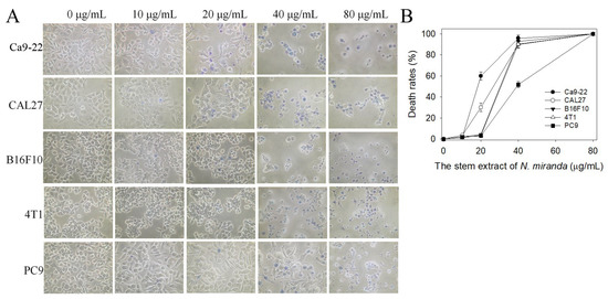 Trypan blue staining assay. (A) Cytotoxic effects of the stem extract of N. miranda at different concentrations (10, 20, 40, and 80 μg/mL) on the survival of Ca9-22, CAL27, B16F10, 4T1, and PC9 cells. After 0 and 24 h of incubation with the stem extract, trypan blue staining was used to estimate the cell death rate of these cancer cell lines. (B) The death rates of the cancer cells treated with the stem extract of N. miranda. The cytotoxic activities of 20 μg/mL of the stem extract of N. miranda against the cancer cells followed the order Ca9-22 > CAL27 > PC9 > 4T1 > B16F10 cells. The errors are the standard deviation, as determined over 3 measurements.