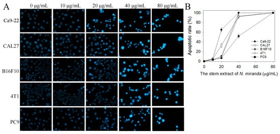Whether the stem extract of N. miranda could induce apoptosis of Ca9-22, CAL27, PC9, 4T1, and B16F10 cells was also investigated (Figure 7A). The apoptosis induced by this extract in these cancer cells was estimated by using the Hoechst staining assay. Hoechst 33342 is membrane-permeable and detects all nucleated cells [39]. Through the Hoechst staining assay, we found that the stem extract of N. miranda, at a concentration of 80 μg/mL, could induce apoptosis (Figure 7B), with 100% DNA fragmentation identified in these cancer cells. Incubation with 20 μg/mL of the stem extract of N. miranda induced apoptosis in Ca9-22, CAL27, PC9, 4T1, and B16F10 cells at the rates of 65, 33, 10, 8, 7%, respectively. Similar to results obtained from the trypan blue staining assay, the apoptosis-inducing activities also followed the order Ca9-22 > CAL27 > PC9, 4T1, and B16F10 cells.