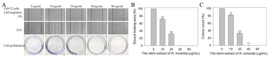 Cytotoxic effects of the stem extract of N. miranda on the migration and proliferation of Ca9-22 cells. (A) The migration and proliferation of Ca9-22 cells were analyzed using wound-healing and clonogenic formation assays. (B) The wound-healing assay. The stem extract of N. miranda at a concentration of 40 μg/mL completely inhibited Ca9-22 cell migration. (C) A clonogenic formation assay. The stem extract of N. miranda at a concentration of 40 μg/mL suppressed the proliferation and colony formation of Ca9-22 cells by 99%. ** p < 0.01 and *** p < 0.001 compared with the control group.