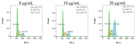 Due to having the highest activities, Ca9-22 cells were chosen for the analysis of the cell cycle progression induced by the stem extract of N. miranda. The cell cycle impact was examined using flow cytometry (Figure 9). Incubation with the stem extract of N. miranda at concentrations of 10 and 20 μg/mL boosted the distribution of the G2 phase from 7.9% to 16.6% and 29.2% in the Ca9-22 cells, respectively. Therefore, the stem extract of N. miranda might suppress carcinoma cell proliferation by inducing G2 cell cycle arrest.
