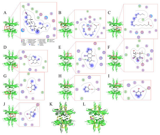 Our GC-MS results show that at least 16 compounds were detected in the stem extract of N. miranda (Figure 5), and, thus, certain compounds in this extract might be responsible for the inhibition of KpSSB. Recently, we solved the crystal structure of KpSSB [33]; therefore, this structure is available for the study of molecular docking (PDB ID 7F2N). To predict the binding site(s), we elucidated the compound’s mode of binding to KpSSB and calculated the binding energies using the MOE (molecular operating environment) Dock tool (Figure 10). The 10 most abundant compounds in the stem extract of N. miranda were used for docking analysis. According to the docking score (the S score), the binding affinities were predicted for the KpSSB–ligand complexes with all possible binding geometries. Based on the S scores (Table 3), the binding capacity of these compounds was in the following order: sitosterol (Figure 10A) > hexadecanoic acid (Figure 10B) > oleic acid (Figure 10C) > plumbagin (Figure 10D) > 2-ethyl-3-methylnaphtho[2,3-b]thiophene-4,9-dione (Figure 10E) > methyl α-d-galactopyranoside (Figure 10F) > 3-methoxycatechol (Figure 10G) > catechol (Figure 10H) > pyrogallol (Figure 10I) > hydroxyhydroquinone (Figure 10J). As it had the highest S score, sitosterol might exhibit the greatest binding affinity toward KpSSB among the selected compounds. According to the modeled structure of the KpSSB–ssDNA complex (Figure 10K), it is likely all these compounds occupy the ssDNA-binding sites of KpSSB (Figure 10L). The KpSSB inhibitory capacity of the stem extract of N. miranda might derive from the co-effects of some of these compounds.