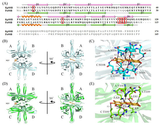 Structural analysis of KpSSB. (A) Sequence alignment of KpSSB and PaSSB. The secondary structural elements of KpSSB and PaSSB are shown with the sequences. Residues not observed in the crystal structure of KpSSB (PDB ID 7F2N) and PaSSB (PDB ID 5YUN) are in gray. Residues K7, E80, I105, N106, G107, and N108 in PaSSB are involved in myricetin binding (boxed in red). The corresponding residues in KpSSB are K8, E81, V106, G107, G108, and T109. Only K8 and E81 in KpSSB were conserved as possible sites for myricetin binding. (B) The complexed crystal structure of PaSSB. Myricetin sandwiched by PaSSB monomers A and C is in bright orange. (C) The myricetin-binding mode to PsSSB. (D) The superimposed structures of KpSSB and the myricetin-complexed PaSSB. (E) The proposed myricetin-binding mode of KpSSB. Several interactions in the myricetin–PaSSB complex were not found in this modeled myricetin–KpSSB complex. This may explain why myricetin cannot inhibit KpSSB because the myricetin-interacting residues are significantly different in KpSSB.