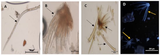 (A–D) Light micrographs (LM) of trichomes found on Grewia lasiocarpa E. Mey. Ex Harv. leaves* and stem bark powder. Non-glandular trichomes stained with Iodine (A,B), stained with potassium hydroxide (C), and stained with petroleum ether under ultra-violet light (D*).