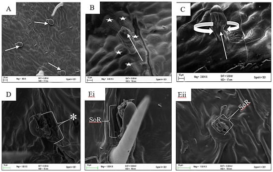 (A–Eii) The process of the release of metabolites in micrographs (A–Eii). Sequential rupture (broken cuticle) and release of metabolites in the subcuticular space of Grewia lasiocarpa E. Mey. Ex Harv. *Turgor pressure, capitate trichome (arrow), (SoR) Site of rupture (broken cuticle).