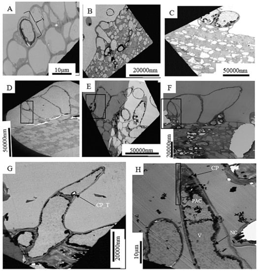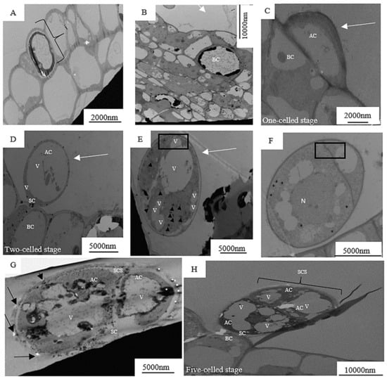 (A–H) Transmission electron micrographs of transverse section during successive stages of peltate trichome development of Grewia lasiocarpa E. Mey. Ex Harv. Abbreviations: AC—Apical cell, BC—basal cell, HC—head cell, SCS—sub-cuticular space, V—vacuole.