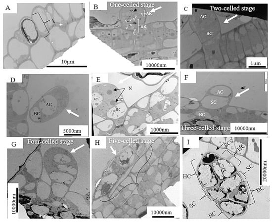 (A–I) Transmission electron micrographs of transverse sections during the successive stages of capitate trichome development of Grewia lasiocarpa E. Mey. Ex Harv. Abbreviations: AC—Apical cell, BC—basal cell, HC—head cell, SCS—sub-cuticular space.