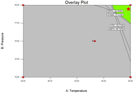 To optimize the conditions of SFE for achieving desirable extract yields, total phenolic compounds, and antioxidant activities in the ME, the central composite design (CCD) was employed. Through this design, it was determined that an SFE temperature of 60 °C and pressure of 20 MPa, as depicted in Figure 2, could yield optimal results, including an extract yield of 18.99%, total phenolic compounds of 27.48 mg GAE/mL, and DPPH and ABTS antioxidant activities of 28.64 µg/mL and 37.46 µg/mL, respectively. The predicted results closely matched the experimental results obtained using the optimum extraction conditions, thereby confirming the validity of the CCD model and demonstrating a strong correlation. Additionally, the desirability function approach was employed to predict a set of optimal conditions for all four response variables.