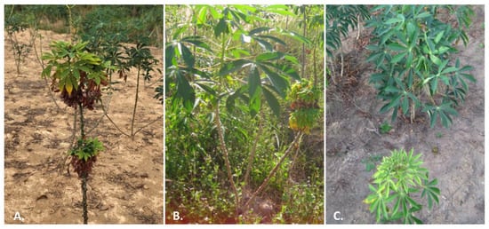 In general, the symptoms of witches’ broom are associated with phytoplasma infections and have been reported in more than 116 plant species [19], making phytoplasma an emergent group of crop pathogens [20,21]. Nevertheless, phytoplasma detected in cassava in the Americas (ribosomal group 16SrIII) is found in plants with different symptoms such as a frogskin-like appearance of the roots [22,23,24], or a proliferation of shoots starting at the base of the main stem [25,26]. Current available protocols designed to detect CWBD phytoplasma [27] give unspecific and inconsistent results (not shown), and, to the best of our knowledge, there are no association studies of any of the reported phytoplasma and witches’ broom symptoms in cassava. Although such results can be a consequence of specificities of phytoplasma biology (e.g., tropism, low titers, and inability to grow in vitro), it is important to consider that fungal and viral pathogens have been also reported to induce witches’ broom-like symptoms in plants. Moniliophthora perniciosa causes witches’ broom disease in cacao (Theobroma cacao). The top part of infected cacao plants grows a green broom which dries up as the fungal infection progresses [28]. In several ornamental cherry species, branches of plants infected with Taphrina weisneri swell and shoots with many smaller and thicker leaves emerge at the point of swelling [29]. In Longan, a potyvirus (Longan witches’ broom-associated virus) is associated with a characteristic dense shoot on branches of infected plants [30,31]. Considering that cassava is a vegetatively propagated crop, i.e., prone to build up mixed pathogen infections, further research on the causal agent of CWBD should also look further than phytoplasma.