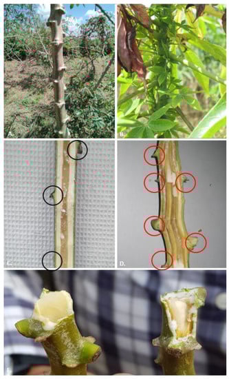 The characteristic symptoms of CWBD include dwarfism and proliferation of weak, spindly sprouts on the stakes (Figure 1). Cassava stems then develop short internodes, with small yellowish leaves, and show dark vascular necrosis, while the roots are thinner, and smaller (Figure 2). Attempts to transmit the disease via grafting have also been challenging. When using grafts from unaffected parts of the plant, the disease could not be transmitted, and when using grafts from affected stems, the observed vascular necrosis kills most grafts used in screenhouse assays (not shown). Due to the significant effect that CWBD has on stem development, cassava vegetative seed production (stakes) is significantly limited, forcing farmers to acquire planting material from other sources and therefore increasing the risk of introducing additional seed-borne pathogens [4,5].