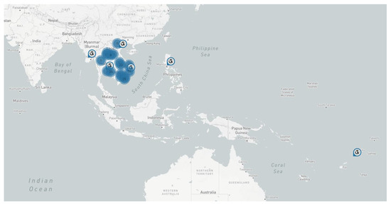 Map showing the current geographical location of CWBD symptoms reported in Asia, according to a global literature search using Google Scholar. Information from CIAT’s annual reports is included. Locations reporting the disease more than once are indicated with a number in a blue circle, otherwise the symbol refers to a single report of the disease. Links to each report are available from the interactive map at: https://pestdisplace.org/embed/news/map/disease/3 (accessed on 15 May 2023) [47]. This information was last updated on 30 March 2023.