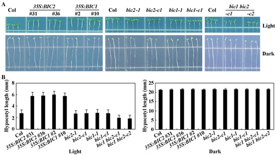 2.3. Light-Grown Seedlings of the BICs Overexpression Plants Produced Longer, Whereas the bic1 bic2 Double Mutants Produced Shorter Hypocotyls