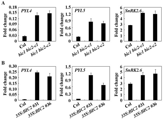 2.5. The Expression of Some ABA Signaling Core Regulator Genes Were Affected in the bic1 bic2 Double Mutants and the 35S:BIC2 Transgenic Plants
