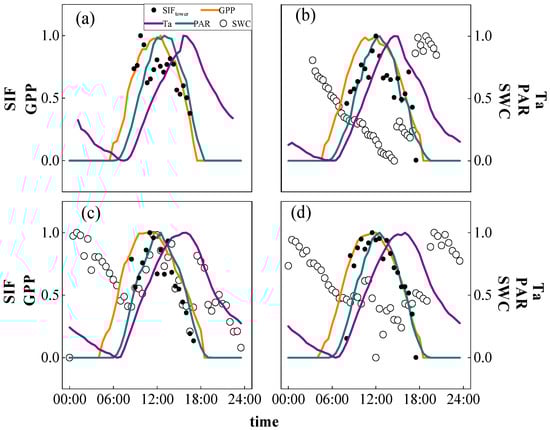 The strongest solar radiation in a day occurs at around 12:00, but the atmosphere is not directly heated from the solar radiation, because the solar radiation warms the ground first, absorbs the heat, reflects back to the atmosphere, and then warms up; therefore, the strongest solar radiation appeared at noon, and the highest atmospheric temperature occurs in the afternoon. In this study, we found that the times when PAR, SIF and GPP reach their maximum values are similar, while Ta lags behind these changes. This shows that SIF and GPP mainly respond to changes in PAR, which is the same conclusion as those drawn in previous studies [18].