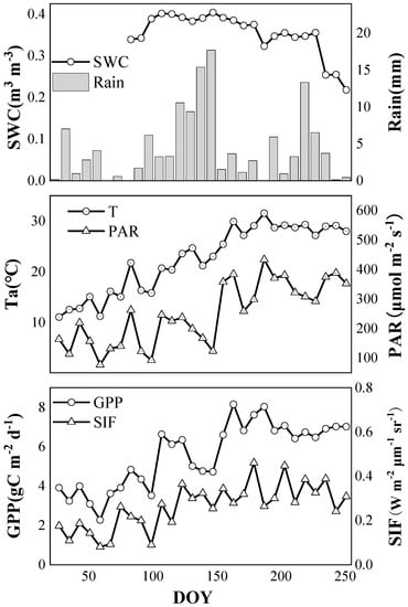 (3) Ta and PAR significantly affect the changes in the SIF and GPP at different time scales, while SWC has no significant impact on them. With the increase in Ta, PAR or SWC, the linear correlation between SIF and GPP decreases gradually. When Ta or PAR is high, there is no significant linear correlation between SIF and GPP.