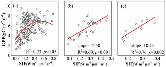 Previous studies showed that the relationship between SIF and GPP is affected by environmental factors [28,29]. Some studies have indicated that under drought or high-temperature conditions, vegetation photosynthesis is affected by climate, and SIF shows a significant decline, reflecting the high sensitivity of SIF to climate change. Therefore, climate change also affects the correlation between SIF and GPP [30,31].