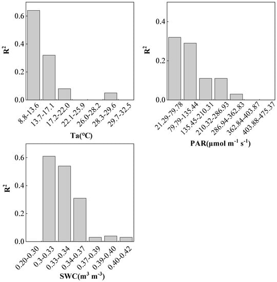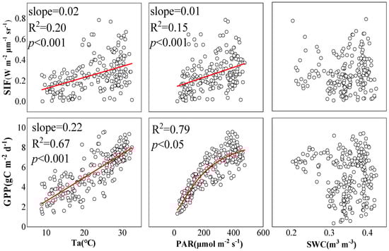 It can be seen that Ta and PAR had a significant impact on the changes in SIF and GPP, while SWC did not have a significant impact on either. Regarding the correlation between SIF and GPP, except when SWC was 0.20–0.30 m3 m−3, SIF had no significant linear correlation with GPP, and the linear correlation between SIF and GPP gradually decreased with the increase in Ta, PAR or SWC. When Ta or PAR was much higher, no significant linear correlation appeared between SIF and GPP.