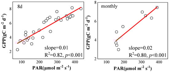 In the subtropical evergreen coniferous forest, the correlation between the SIF of vegetation and GPP became more significant with the increase in temporal scales (Figure 3). On the daily scale, SIF and GPP showed a nonlinear correlation, and SIF only explained 23% of the changes to GPP. On the 8-day scale and the monthly scale, the correlation between SIF and GPP became more linear. On the 8-day scale, the correlation between SIF and GPP was 0.60, and the slope was 12.50. On the monthly scale, the correlation between SIF and GPP attained 0.76, and the slope was 18.43.