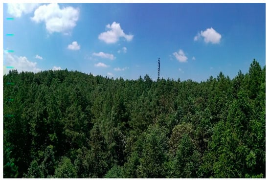 Qianyanzhou Ecological Research Station is located in Taihe County, Jiangxi Province (26°44′29″ N, 115°3′29″ E), which is located in the southern hilly area in China. It is a typical red soil area with subtropical monsoon climate characteristics. The region is rich in solar energy resources, with annual average sunshine of 1306 h. The annual average temperature is 17.9 °C. The annual average rainfall can reach 1490.5 mm. Apart from the abundant rainfall and heat resources in this region, due to the uneven seasonal distribution and the incomplete synchronization between rainfall and temperature, the influences of high temperature and seasonal drought in summer occurred frequently [20]. The vegetation in this area is evergreen coniferous plantation in the middle subtropical zone in China, which is mainly composed of secondary vegetation of artificial forest or grass and shrub, including Pinus massoniana, Pinus elliottii, Cunninghamia lanceolata, etc. [19]. The forest in this area was planted in the 1980s, with a forest age of approximately 40 years (Figure 7).