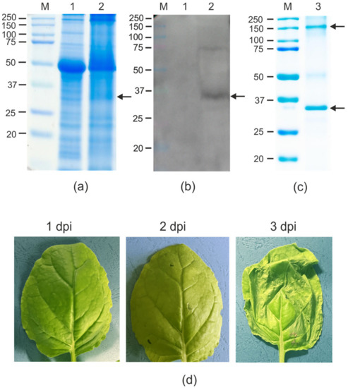 The 19S_SAP_Sp_4M2eh protein was expressed in N. benthamiana plants using the pEff viral vector [42] (Figure 1a). N. benthamiana leaves were infiltrated with agrobacteria carrying the recombinant vector pEff/19S_SAP_Sp_4M2eh. Necrosis in the infiltration zones was observed already 2–3 days post-infiltration (dpi) (Figure 2d). Probably, this effect is associated with the toxicity of SAP for plant cells, since the expression of SAP without M2e using the pEff vector caused necrosis already on the second day after infiltration.