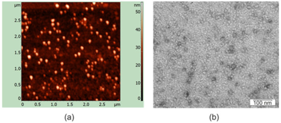 Atomic force microscopy was performed using an Integra Prima microscope and Nova SPM software (NT-MDT, Moscow, Russia). The scanning was performed in the semi-contact mode using gold cantilever NSG01 (NT-MDT). Particle sizes (n = 20) were determined using the NT-MDT Nova v. 1.06.26 software supplied with the instrument.