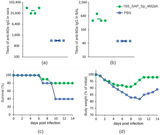 Immunogenicity and protective efficiency of 19S_SAP_Sp_4M2eh nanoparticles. Titers of IgG antibodies to synthetic M2e peptide in sera (a) and BAL (b) of immunized mice after the third immunization. The values for 4 animals (circles and squares) and the geometric mean titers (horizontal lines) are shown. The survival rate (c) and body weight changes (d) of immunized and control (PBS) mice was monitored for 14 days post-challenge with 4 × LD50 of A/Aichi/2/68 (H3N2) influenza A virus.