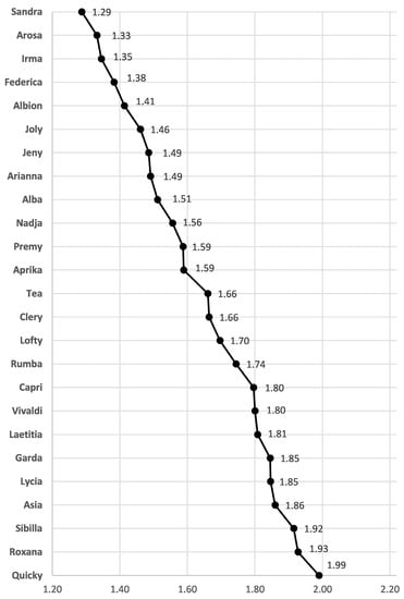 TQI is a reliable mathematical tool that enables the comparison of quantitatively evaluated individual parameters of strawberry fruits, regardless of expression units, to obtain a single score for an overall fruit quality []. TQI results for all sugars and organic acids quantified by HPLC in fruits of 25 newly introduced strawberry cultivars are presented in Figure 1. Cultivar ‘Sandra’ had the best TQI score (1.29), followed by ‘Arosa’ (1.33), and ‘Irma’ (1.35). On the contrary, the worst TQI values were calculated for ‘Quicky’ (1.99), ‘Roxana’ (1.93), and ‘Sibilla’ (1.92). TQI showed that the overall fruit quality scores were clearly distinguished among different strawberry cultivars, while ‘Sandra’ could be considered the best cultivar in terms of overall fruit quality.