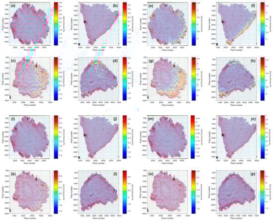 The distribution of biomarker molecules according to the MSI analyses of two representative strawberry cultivars. (a,b) C6H12O6 ([M + K]+, m/z = 219.026546 Da) in ‘Sandra’ and (c,d) in ‘Aprika’; (e,f) C12H22O11 ([M + K]+, m/z = 381.079369 Da) in ‘Sandra’ and (g,h) in ‘Aprika’; (i,j) C18H32O16 ([M + K]+, m/z = 543.132193 Da) in ‘Sandra’ and (k,l) in ‘Aprika’; (m,n) C6H8O7 ([M + K]+, m/z = 230.990161 Da) in ‘Sandra’, and (o,p) in ‘Aprika’. The observed intensity is presented logarithmically and color-coded (see color bar).