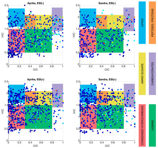 According to Figure 4, compounds from all six compound classes are assumable in the extracts of cultivars ‘Aprika’ and ‘Sandra’. In particular, molecules which are lipids, peptides/proteins, and amino sugars are primarily detected by ESI(+). In contrast, ESI(−) seems to be more convenient for ionizing carbohydrates, as more data points are visible in the van Krevelen plot of the ESI(−)-MS data in this region (O/C = 0.8–1.3, H/C = 1.4–2.4). Thus, from these van Krevelen plots, we can derive that a high amount of organic acids, sugars, and polyphenolic compounds are present in both cultivars, as most of the ions were assigned to lipids, carbohydrates, lignin-like structures, and condensed hydrocarbons.