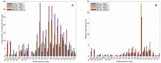 In order to learn more about the molecules and compound classes that are present in the extracts from ‘Aprika’ and ‘Sandra’, the mass spectral data were further evaluated by clustering the assigned molecular formulae into heteroatomic classes, based on the number of nitrogen, oxygen, and/or sulfur that was assigned to a molecular ion. These heteroatomic compound clusters were then evaluated according to the total number of assigned molecular formulae and the relative abundance of different heteroatomic classes. Visualizations for these two assessment parameters for compound classes N1O4–N1O8, S1, S1O5–S1O6 and O1–O16 are illustrated in Figure 5, as these compound classes showed the highest number of assigned molecular formulae.