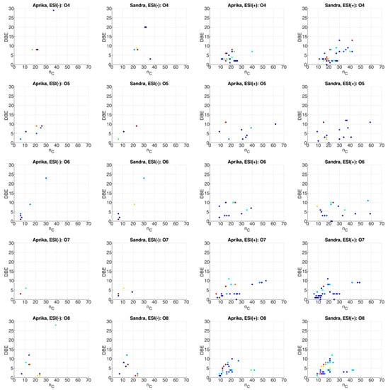 The nC-DBE plots for heteroatomic classes O4–O8 are visualized in Figure 6. Furthermore, illustrations for heteroatomic classes O1–O3, O9–O16, N1O4–N1O8, as well as S1 and S1O5–S1O6, are illustrated in the Supporting Information to this paper (see Figures S1–S5). From these plots we can derive that mainly non-aromatic molecules with multiple hydroxy, carbonyl, aldehyde, carboxy or ester groups are potentially present in the heteroatomic classes O1–O16, as most of the compounds possess DBE values ≤ 5 (see Figure 6 and Figures S1–S3). Thus, organic acids, such as oxocarboxylic acids (O3, DBE = 2), dicarboxylic acids (O4, DBE = 2), tricarboxylic acids (O6, DBE = 3), tetracarboxylic acids (O8, DBE = 4), pentacarboxylic acids (O10, DBE = 5), and hexacarboxylic acids (O12, DBE = 6) with nC values between 11 and 43 can be supposed in the extracts of both cultivars. Higher oxygen numbers and DBE values could correspond to analogous structures that contain additional oxygen-containing functional groups (e.g., hydroxy). Additionally, monosaccharides up to trisaccharides can be assumed according to the nC-DBE plots of the oxygen-containing heteroatomic classes, as molecules with a relatively high oxygen number (o ≤ 18) but low nC (nC ≤ 18) and DBE values (DBE ≤ 3) are present. Aromatic molecules are also assumable, according to the nC-DBE plots of compound classes O6–O16 (DBE ≥ 4). These molecules are, most likely, flavonoids or anthocyanins, which are part of the polyphenolic compounds that are typically found in strawberries [,,,,,,,,].
