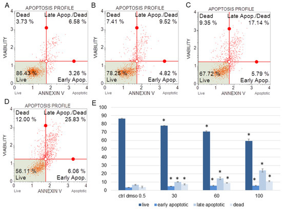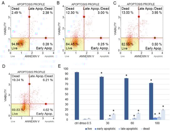 The percentages of live, apoptotic, and dead HeLa cells after treatment with the water fraction of Kalanchoe blossfeldiana. The cells were treated with DMSO (0.5%, v/v, (A)) and the fraction at concentrations of 30 (B), 60 (C), and 100 µg/mL (D) for 24 h. The analysis was performed by flow cytometry. All the results are shown in the graph (E) and compared with the control. Each sample was run at least in two independent repeats (in three repetitions). Error bars indicate standard deviations. Significant differences relative to the control are marked with an asterisk “*” (p < 0.05).