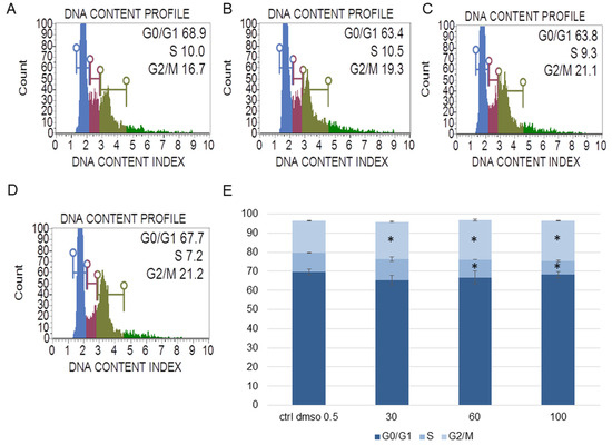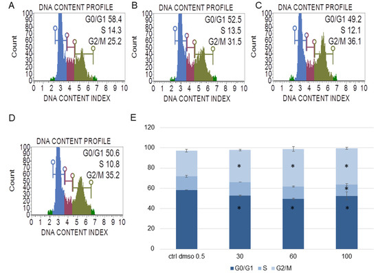 The effect of the water fraction of Kalanchoe blossfeldiana on cell cycle in HeLa cells after 48 h of treatment. The cells were treated with DMSO (0.5%, v/v, (A)) and the fraction at concentrations of 30 (B), 60 (C), and 100 µg/mL (D) and analyzed by flow cytometry. Blue color—G0/G1, purple—S, and green—G2/M phase. The percentage of the cells in each phase was determined in comparison with the control (E). The experiment was repeated in two independent repeats (in three repetitions). Error bars represent standard deviations. Significant differences relative to the control are marked with an asterisk “*” (p < 0.05).