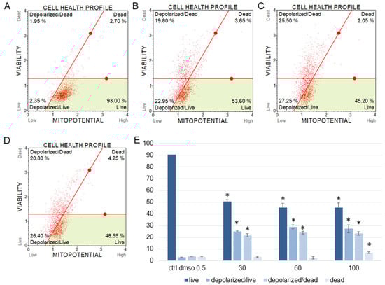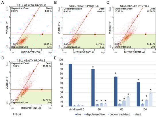 Mitochondrial membrane potential changes in HeLa cells treated with the water fraction of Kalanchoe blossfeldiana. The cells were treated with DMSO (0.5%, v/v, (A)) and the fraction at concentrations of 30 (B), 60 (C), and 100 µg/mL (D) for 24 h. The analysis was performed by flow cytometry. The percentages of live, depolarized/live, depolarized/dead, and dead cells are shown in the graph (E) and compared with the control. Each sample was run at least in two independent repeats (in three repetitions). Error bars indicate standard deviations. Significant differences relative to the control are marked with an asterisk “*” (p < 0.05).