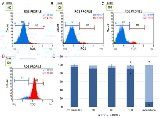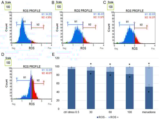 Changes in the level of oxidative stress in SKOV-3 cells treated with the water fraction of Kalanchoe blossfeldiana. The cells were treated with DMSO (0.5%, v/v, (A)) and the fraction at concentrations of 60 (B), 100 µg/mL (C), and menadione at 200 µM (D) for 24 h. The analysis was performed by flow cytometry. The percentages of ROS negative (ROS−) and ROS positive (ROS+) cells are shown in the graph (E) and compared with the control. Menadione was a positive control. Each sample was run at least in two independent repeats (in three repetitions). Error bars indicate standard deviations. Significant differences relative to the control (DMSO) are marked with an asterisk “*” (p < 0.05).