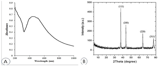 The UV-Vis absorption spectra of the produced AgNPs were examined between 200 and 1000 nm (Figure 1A). The majority of AgNPs contain a surface plasmon resonance (SPR) band between 420 and 550 nm [41,42,43], which is caused by the excitation of free electrons. AgNPs were found to have an SPR value of 446 nm, which is consistent with results from several other studies [44,45,46].