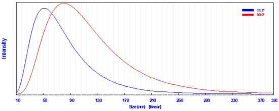 A common technique for determining how the sizes of particles are dispersed in a colloidal fluid is dynamic light scattering (DLS) [49]. The DLS analysis in the current study revealed that the particle size distribution of the biosynthesized AgNPs in the aqueous medium was broad; however, there was a single peak distribution corresponding to the average particle size, which was found to be 57.3 nm at 11.1° (Figure 2). AgNPs had an average diameter of 87.6 nm at 90.0°.